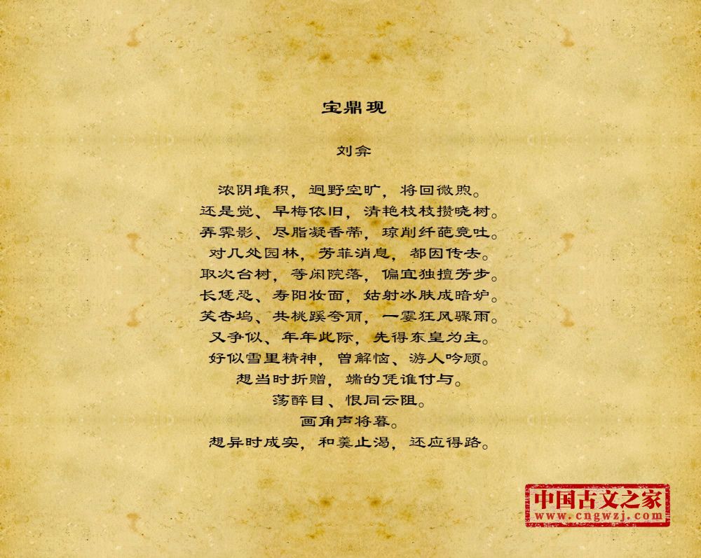 浓阴堆积,迥野空旷,将回微煦。还是觉、早梅依旧,清艳枝枝攒晓树。弄霁影、尽脂凝香蒂,琼削纤葩竞吐。对几处园林,芳菲消息,都因传去。取次台树,等闲院落,偏宜独擅芳步。长恁恐、寿阳妆面,姑射冰肤成暗妒。笑杏坞、共桃蹊夸丽,一霎狂风骤雨。又争似、年年此际,先得东皇为主。好似雪里精神,曾解恼、游人吟顾。想当时折赠,端的凭谁付与。荡醉目、恨同云阻。画角声将暮。想异时成实,和羹止渴,还应得路。