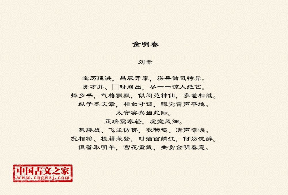 宝历延洪,昌辰开泰,崧岳储灵特异。贤才并、□时间出,尽一一惊人绝艺。捧乡书,气格飘飘,似阆苑神仙,参差相继。纵子墨文章,相如才调,骤觉雷声平地。太守宾兴当此际。正瑞霭寒轻,虚堂风细。舞腰旋、飞尘仿佛,歌管递、清声嘹唳。况相将、桂籍荣登,对酒面鳞江,何妨沈醉。但管取明年,宫花重戴,共赏金明春意。