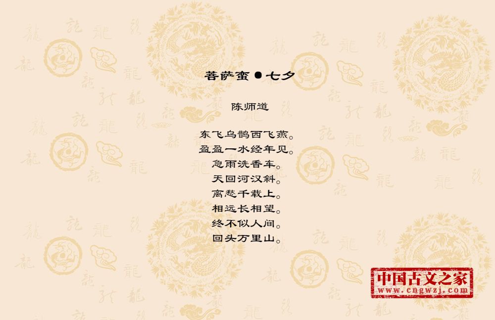 东飞乌鹊西飞燕。盈盈一水经年见。急雨洗香车。天回河汉斜。离愁千载上。相远长相望。终不似人间。回头万里山。