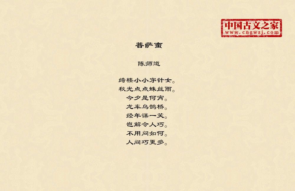 绮楼小小穿针女。秋光点点蛛丝雨。今夕是何宵。龙车乌鹊桥。经年谋一笑。岂解令人巧。不用问如何。人间巧更多。
