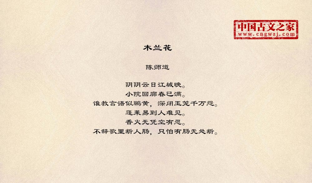阴阴云日江城晚。小院回廊春已满。谁教言语似鹂黄,深闭玉笼千万怨。蓬莱易到人难见。香火无凭空有愿。不辞歌里断人肠,只怕有肠无处断。