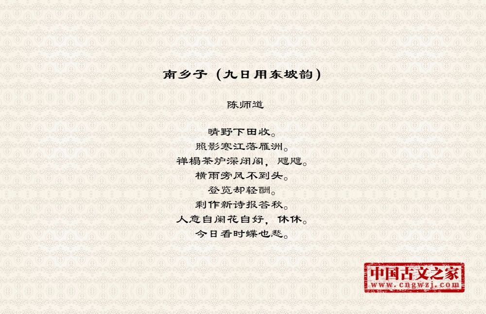 晴野下田收。照影寒江落雁洲。禅榻茶炉深闭阁,飕飕。横雨旁风不到头。登览却轻酬。剩作新诗报答秋。人意自阑花自好,休休。今日看时蝶也愁。