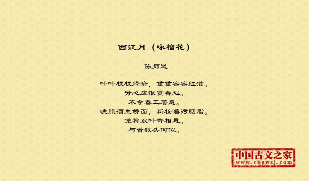 叶叶枝枝绿暗,重重密密红滋。芳心应恨赏春迟。不会春工著意。晚照酒生娇面,新妆睡污胭脂。凭将双叶寄相思。与看钗头何似。