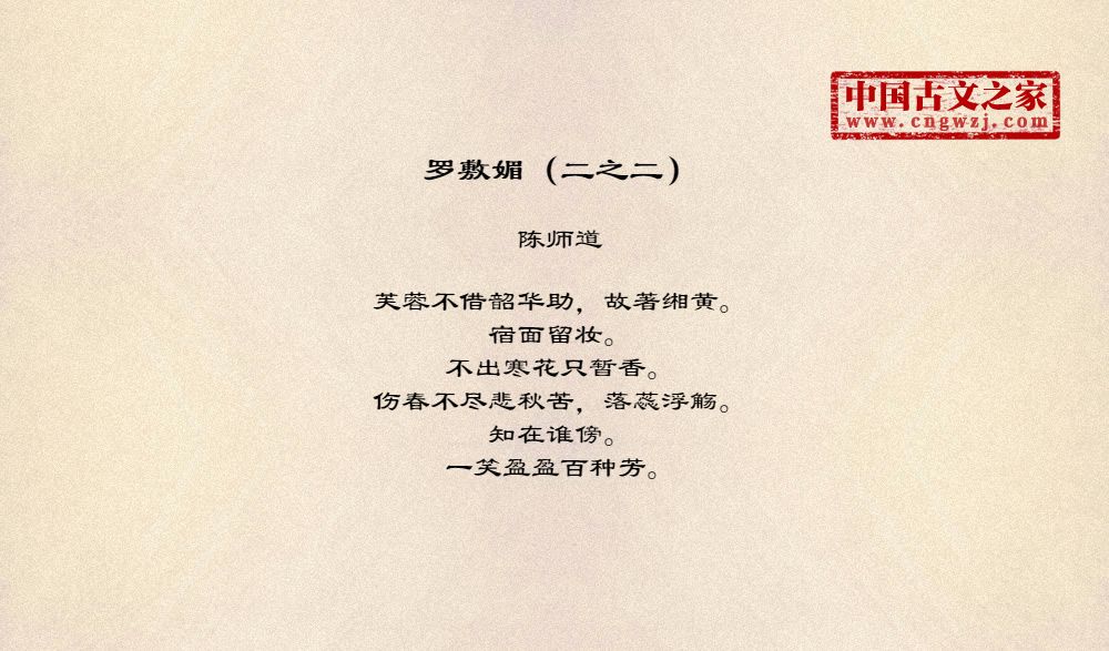 芙蓉不借韶华助,故著缃黄。宿面留妆。不出寒花只暂香。伤春不尽悲秋苦,落蕊浮觞。知在谁傍。一笑盈盈百种芳。