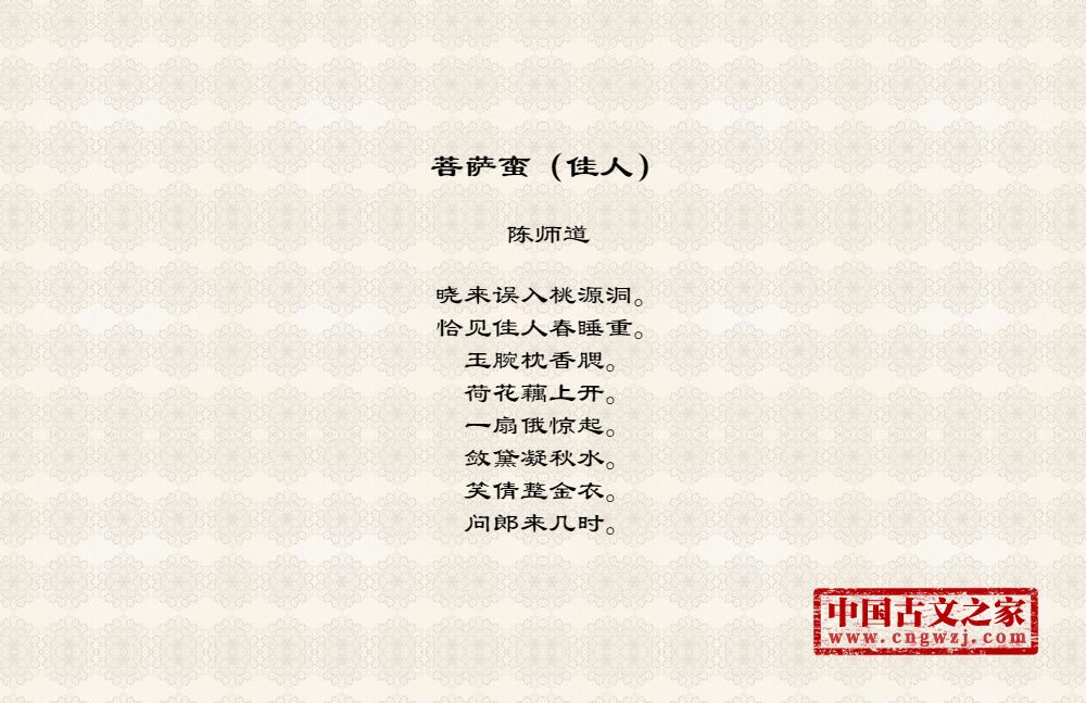 晓来误入桃源洞。恰见佳人春睡重。玉腕枕香腮。荷花藕上开。一扇俄惊起。敛黛凝秋水。笑倩整金衣。问郎来几时。