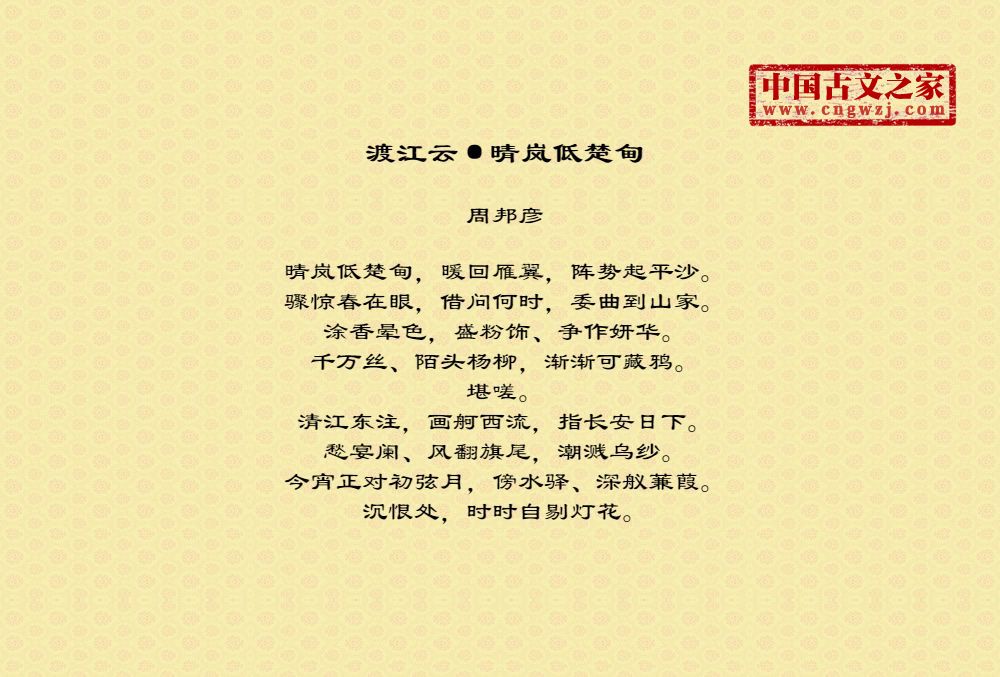 晴岚低楚甸,暖回雁翼,阵势起平沙。骤惊春在眼,借问何时,委曲到山家。涂香晕色,盛粉饰、争作妍华。千万丝、陌头杨柳,渐渐可藏鸦。堪嗟。清江东注,画舸西流,指长安日下。愁宴阑、风翻旗尾,潮溅乌纱。今宵正对初弦月,傍水驿、深舣蒹葭。沉恨处,时时自剔灯花。
