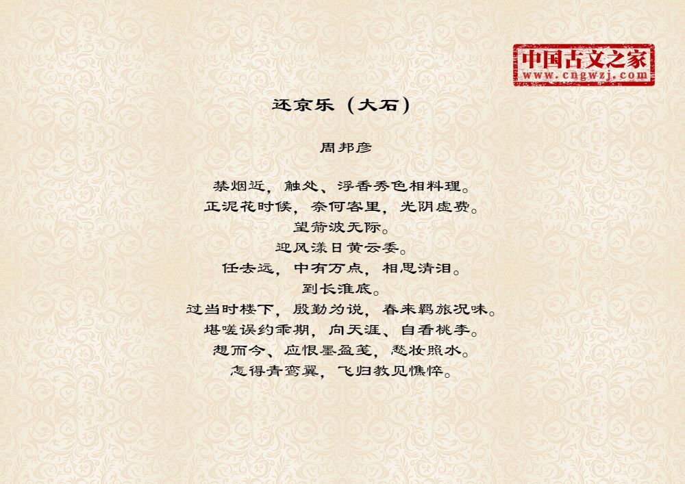 禁烟近,触处、浮香秀色相料理。正泥花时候,奈何客里,光阴虚费。望箭波无际。迎风漾日黄云委。任去远,中有万点,相思清泪。到长淮底。过当时楼下,殷勤为说,春来羁旅况味。堪嗟误约乖期,向天涯、自看桃李。想而今、应恨墨盈笺,愁妆照水。怎得青鸾翼,飞归教见憔悴。