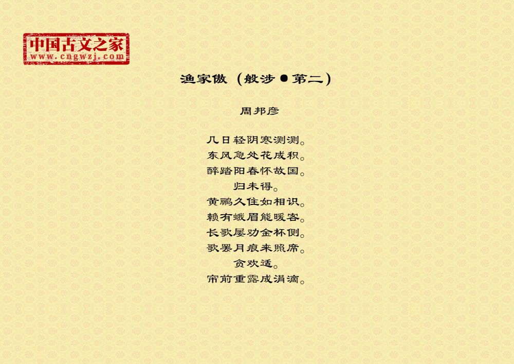 周邦彦(1056年-1121年),中国北宋末期著名的词人,字美成,号清真居士,汉族,钱塘(今浙江杭州)人。历官太学正、庐州教授、知溧水县等。徽宗时为徽
