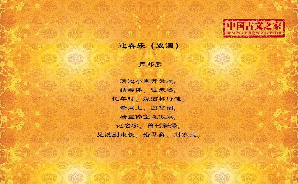 周邦彦(1056年-1121年),中国北宋末期著名的词人,字美成,号清真居士,汉族,钱塘(今浙江杭州)人。历官太学正、庐州教授、知溧水县等。徽宗时为徽
