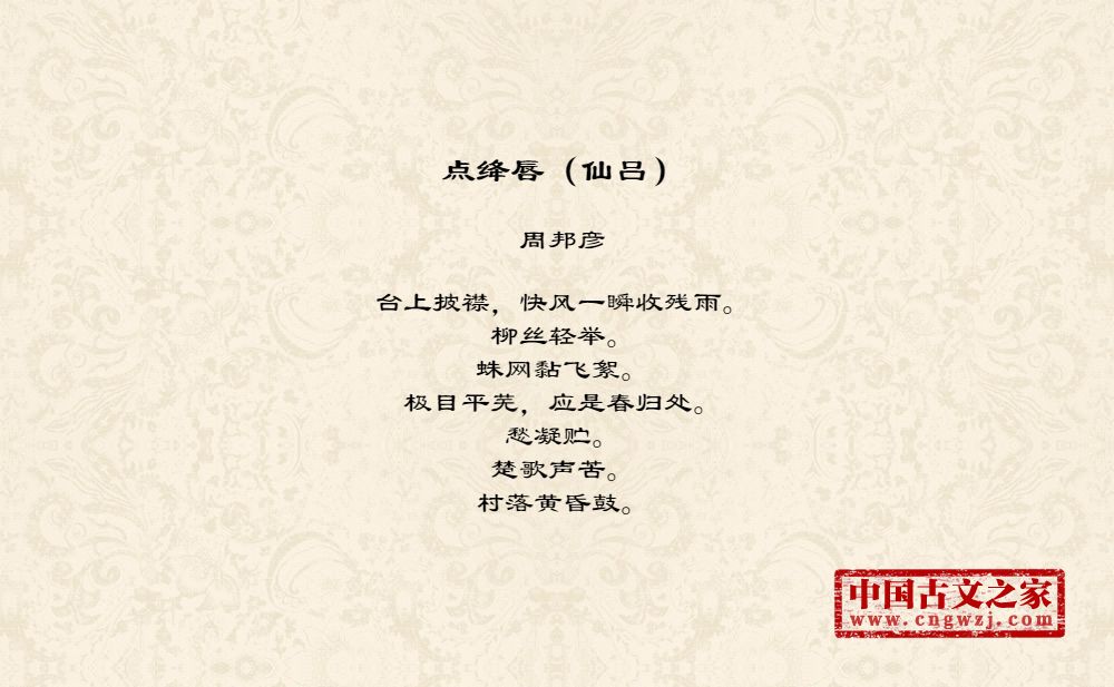 台上披襟,快风一瞬收残雨。柳丝轻举。蛛网黏飞絮。极目平芜,应是春归处。愁凝贮。楚歌声苦。村落黄昏鼓。