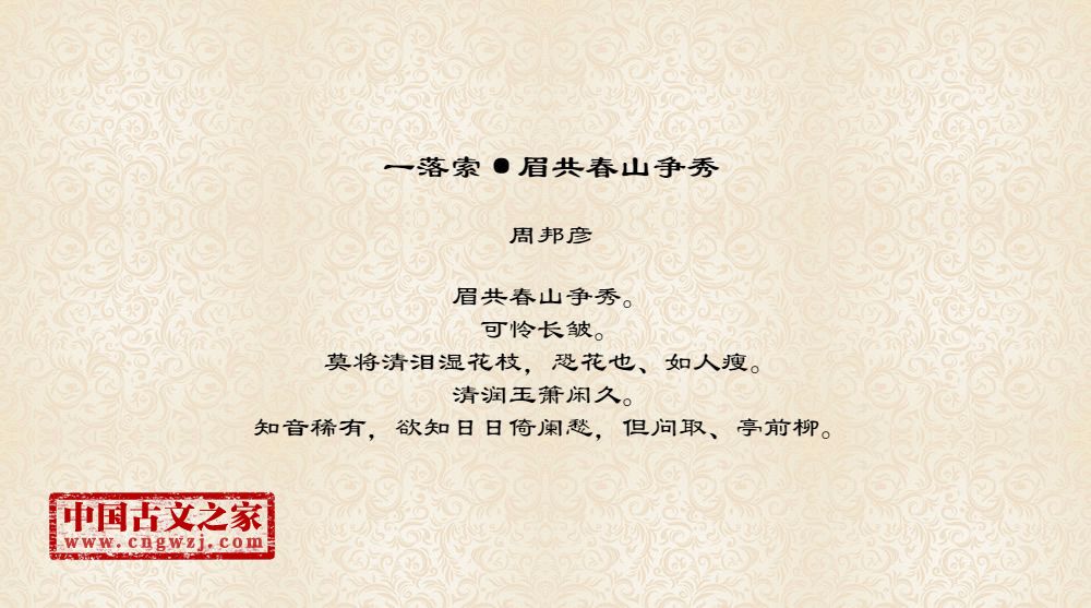 眉共春山争秀。可怜长皱。莫将清泪湿花枝,恐花也、如人瘦。清润玉箫闲久。知音稀有,欲知日日倚阑愁,但问取、亭前柳。