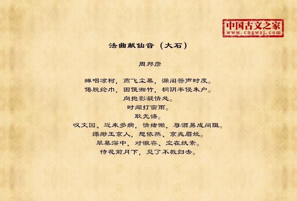 周邦彦(1056年-1121年),中国北宋末期著名的词人,字美成,号清真居士,汉族,钱塘(今浙江杭州)人。历官太学正、庐州教授、知溧水县等。徽宗时为徽