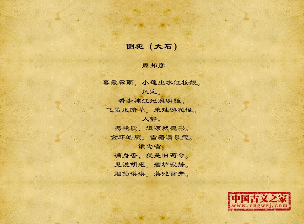 周邦彦(1056年-1121年),中国北宋末期著名的词人,字美成,号清真居士,汉族,钱塘(今浙江杭州)人。历官太学正、庐州教授、知溧水县等。徽宗时为徽