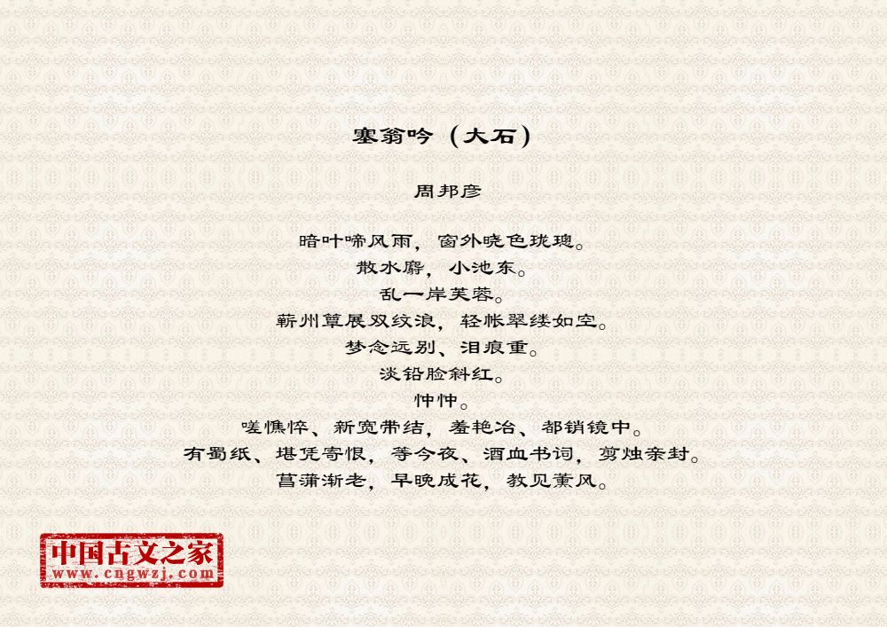 周邦彦(1056年-1121年),中国北宋末期著名的词人,字美成,号清真居士,汉族,钱塘(今浙江杭州)人。历官太学正、庐州教授、知溧水县等。徽宗时为徽