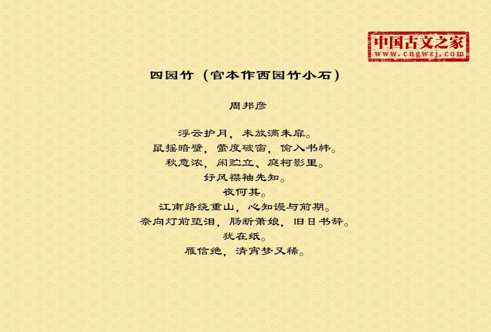 《四园竹(官本作西园竹小石)》的原文打印版(周邦彦)