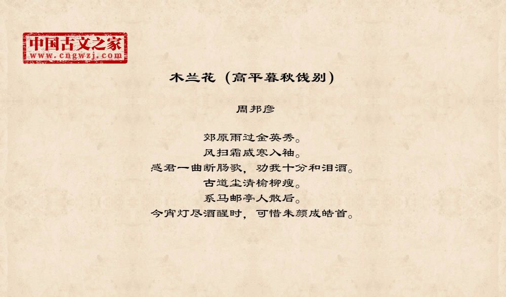 郊原雨过金英秀。风扫霜威寒入袖。感君一曲断肠歌,劝我十分和泪酒。古道尘清榆柳瘦。系马邮亭人散后。今宵灯尽酒醒时,可惜朱颜成皓首。