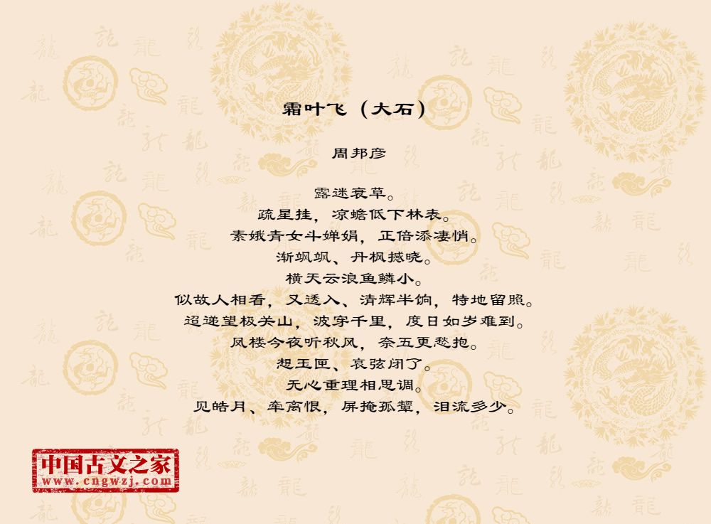 露迷衰草。疏星挂,凉蟾低下林表。素娥青女斗婵娟,正倍添凄悄。渐飒飒、丹枫撼晓。横天云浪鱼鳞小。似故人相看,又透入、清辉半饷,特地留照。迢递望极关山,波穿千里,度日如岁难到。凤楼今夜听秋风,奈五更愁抱。想玉匣、哀弦闭了。无心重理相思调。见皓月、牵离恨,屏掩孤颦,泪流多少。