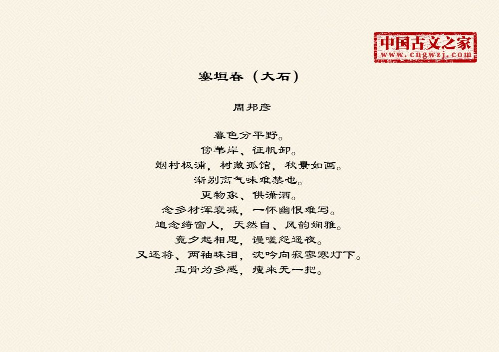 暮色分平野。傍苇岸、征帆卸。烟村极浦,树藏孤馆,秋景如画。渐别离气味难禁也。更物象、供潇洒。念多材浑衰减,一怀幽恨难写。追念绮窗人,天然自、风韵娴雅。竟夕起相思,谩嗟怨遥夜。又还将、两袖珠泪,沈吟向寂寥寒灯下。玉骨为多感,瘦来无一把。