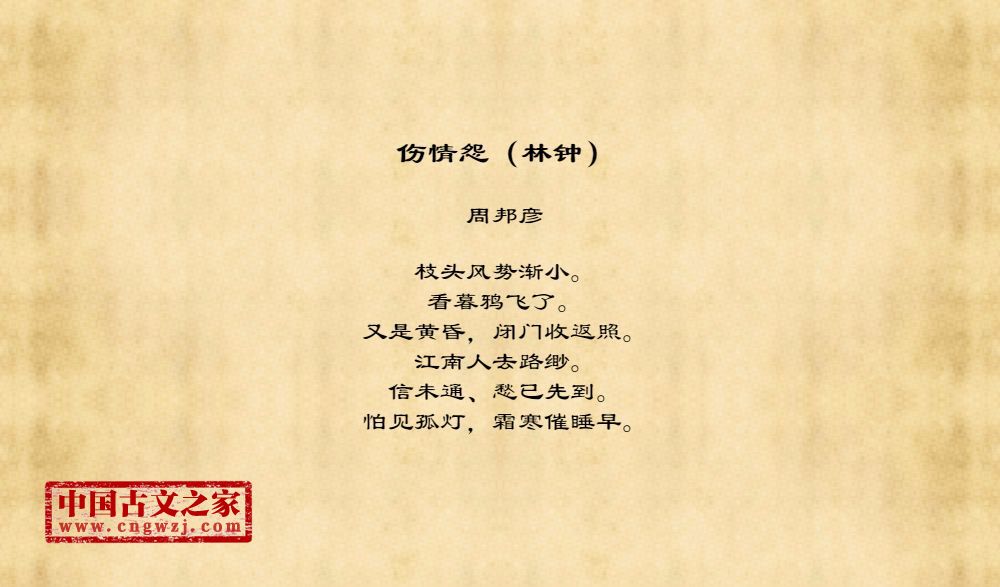 枝头风势渐小。看暮鸦飞了。又是黄昏,闭门收返照。江南人去路缈。信未通、愁已先到。怕见孤灯,霜寒催睡早。