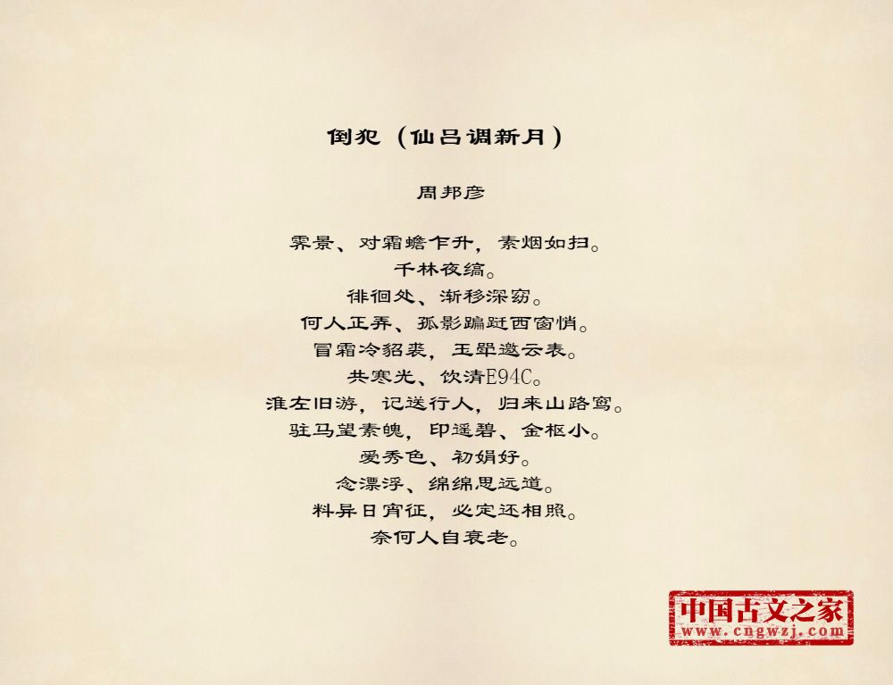 霁景、对霜蟾乍升,素烟如扫。千林夜缟。徘徊处、渐移深窈。何人正弄、孤影蹁跹西窗悄。冒霜冷貂裘,玉斝邀云表。共寒光、饮清E94C。淮左旧游,记送行人,归来山路窎。驻马望素魄,印遥碧、金枢小。爱秀色、初娟好。念漂浮、绵绵思远道。料异日宵征,必定还相照。奈何人自衰老。
