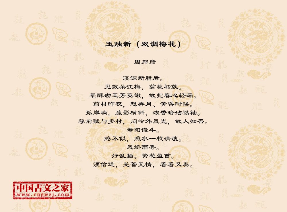 溪源新腊后。见数朵江梅,剪裁初就。晕酥砌玉芳英嫩,故把春心轻漏。前村昨夜,想弄月、黄昏时候。孤岸峭,疏影横斜,浓香暗沾襟袖。尊前赋与多材,问岭外风光,故人知否。寿阳谩斗。终不似,照水一枝清瘦。风娇雨秀。好乱插、繁花盈首。须信道,羌管无情,看看又奏。