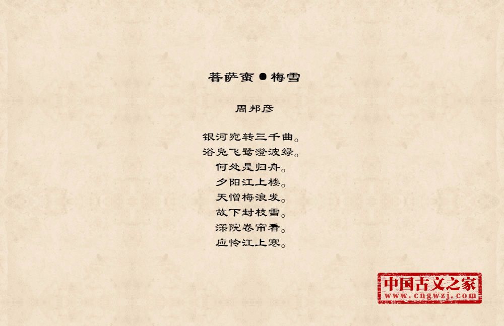 银河宛转三千曲。浴凫飞鹭澄波绿。何处是归舟。夕阳江上楼。天憎梅浪发。故下封枝雪。深院卷帘看。应怜江上寒。