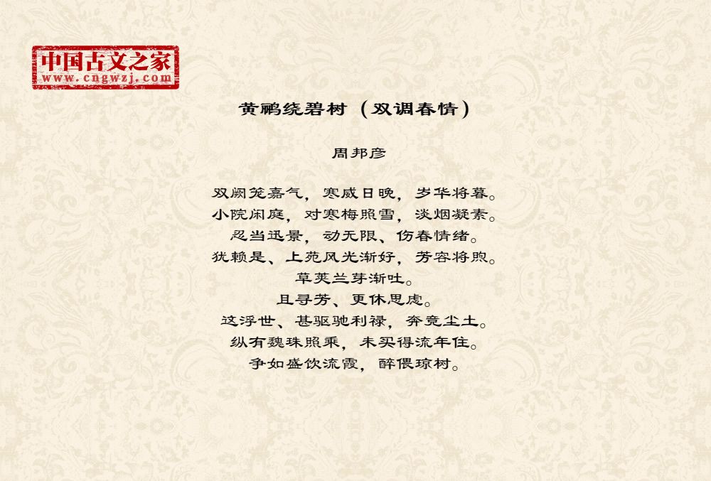 周邦彦(1056年-1121年),中国北宋末期著名的词人,字美成,号清真居士,汉族,钱塘(今浙江杭州)人。历官太学正、庐州教授、知溧水县等。徽宗时为徽