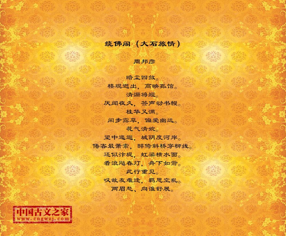 周邦彦(1056年-1121年),中国北宋末期著名的词人,字美成,号清真居士,汉族,钱塘(今浙江杭州)人。历官太学正、庐州教授、知溧水县等。徽宗时为徽