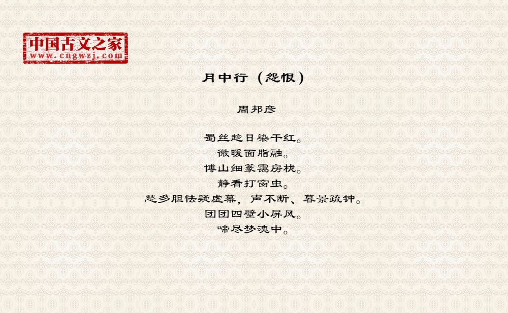 周邦彦(1056年-1121年),中国北宋末期著名的词人,字美成,号清真居士,汉族,钱塘(今浙江杭州)人。历官太学正、庐州教授、知溧水县等。徽宗时为徽
