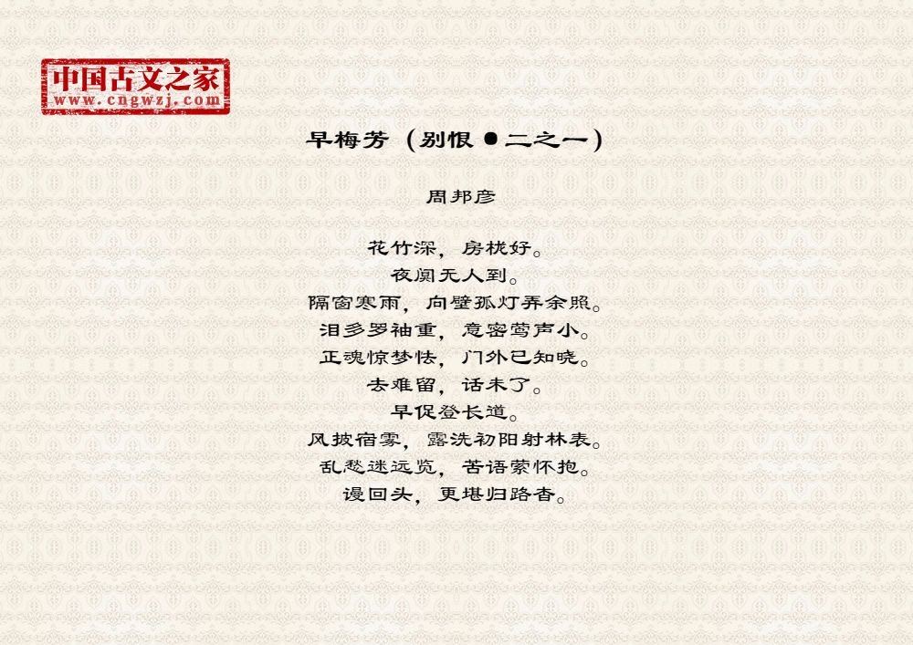 花竹深,房栊好。夜阒无人到。隔窗寒雨,向壁孤灯弄余照。泪多罗袖重,意密莺声小。正魂惊梦怯,门外已知晓。去难留,话未了。早促登长道。风披宿雾,露洗初阳射林表。乱愁迷远览,苦语萦怀抱。谩回头,更堪归路杳。