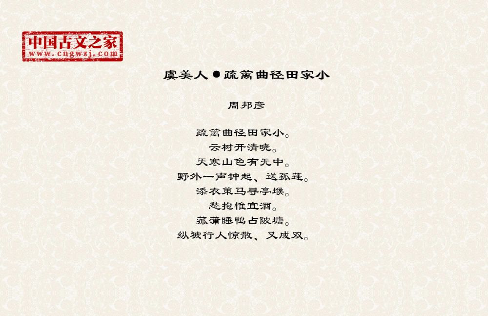 周邦彦(1056年-1121年),中国北宋末期著名的词人,字美成,号清真居士,汉族,钱塘(今浙江杭州)人。历官太学正、庐州教授、知溧水县等。徽宗时为徽