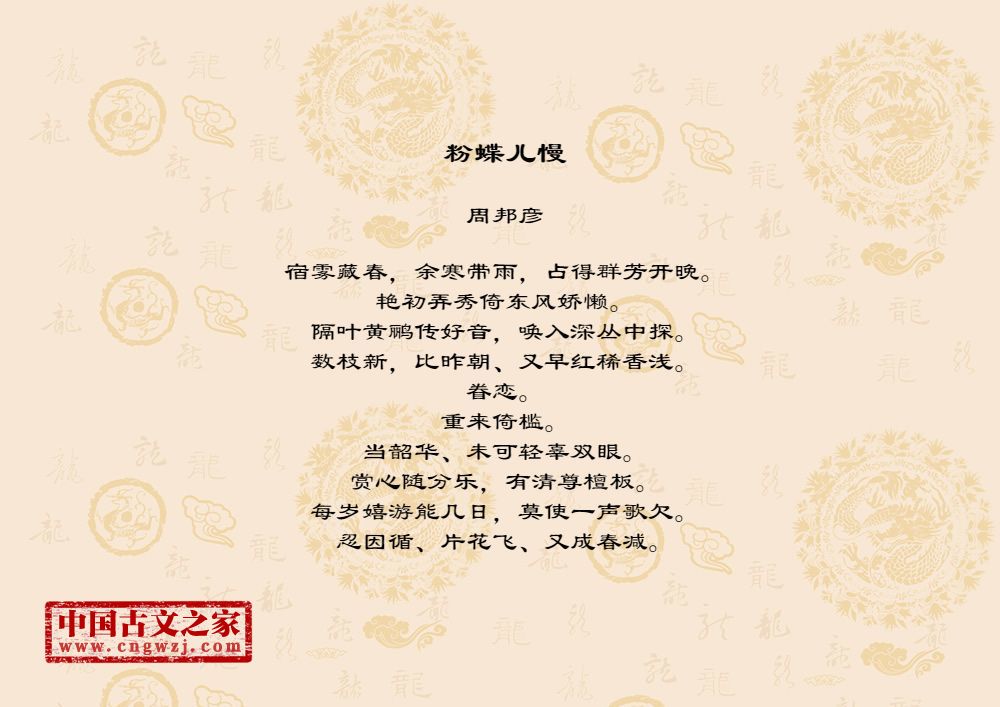 宿雾藏春,余寒带雨,占得群芳开晚。艳初弄秀倚东风娇懒。隔叶黄鹂传好音,唤入深丛中探。数枝新,比昨朝、又早红稀香浅。眷恋。重来倚槛。当韶华、未可轻辜双眼。赏心随分乐,有清尊檀板。每岁嬉游能几日,莫使一声歌欠。忍因循、片花飞、又成春减。