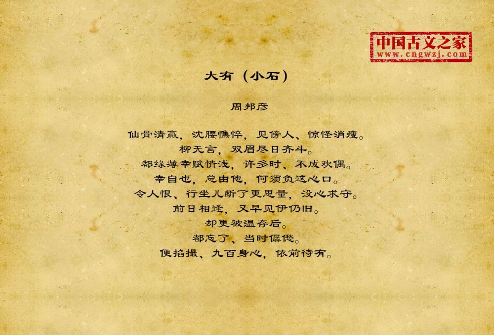 周邦彦(1056年-1121年),中国北宋末期著名的词人,字美成,号清真居士,汉族,钱塘(今浙江杭州)人。历官太学正、庐州教授、知溧水县等。徽宗时为徽