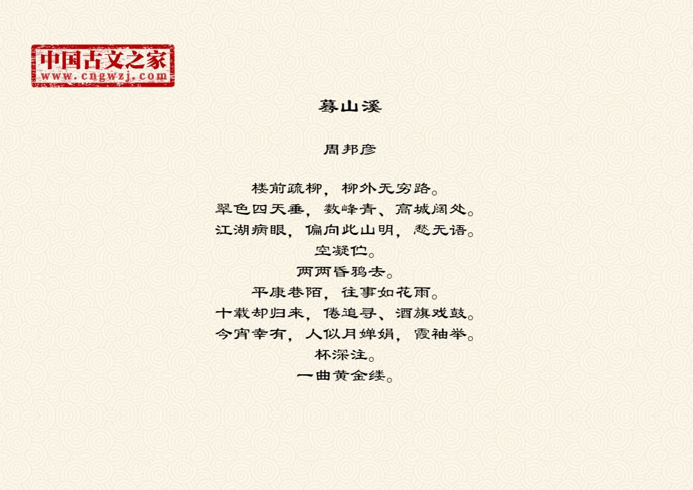 周邦彦(1056年-1121年),中国北宋末期著名的词人,字美成,号清真居士,汉族,钱塘(今浙江杭州)人。历官太学正、庐州教授、知溧水县等。徽宗时为徽