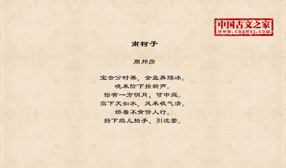 宝合分时果,金盘弄赐冰。晓来阶下按新声。恰有一方明月、可中庭。露下天如水,风来夜气清。娇羞不肯傍人行。扬下扇儿拍手、引流萤。