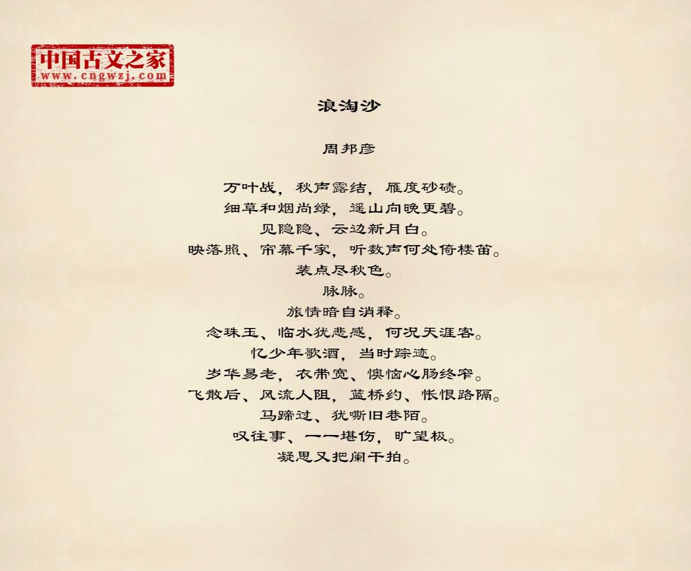 周邦彦(1056年-1121年),中国北宋末期著名的词人,字美成,号清真居士,汉族,钱塘(今浙江杭州)人。历官太学正、庐州教授、知溧水县等。徽宗时为徽