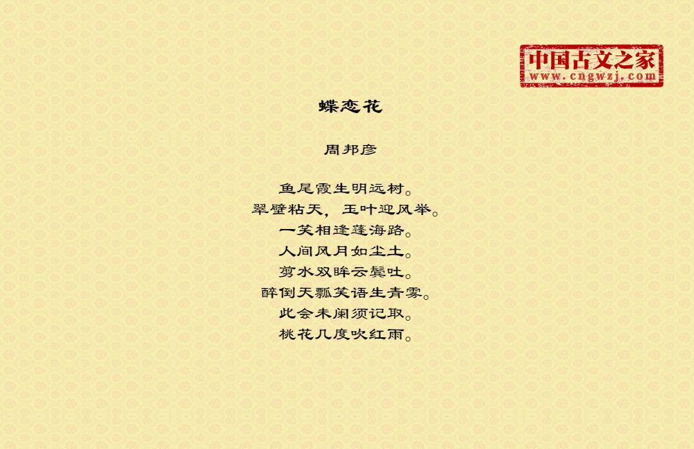 周邦彦(1056年-1121年),中国北宋末期著名的词人,字美成,号清真居士,汉族,钱塘(今浙江杭州)人。历官太学正、庐州教授、知溧水县等。徽宗时为徽