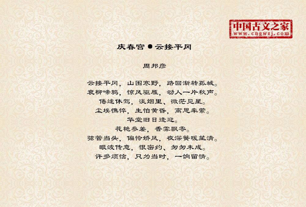 云接平冈,山围寒野,路回渐转孤城。衰柳啼鸦,惊风驱雁,动人一片秋声。倦途休驾,淡烟里、微茫见星。尘埃憔悴,生怕黄昏,离思牵萦。华堂旧日逢迎。花艳参差,香雾飘零。弦管当头,偏怜娇凤,夜深簧暖笙清。眼波传意,恨密约、匆匆未成。许多烦恼,只为当时,一饷留情。