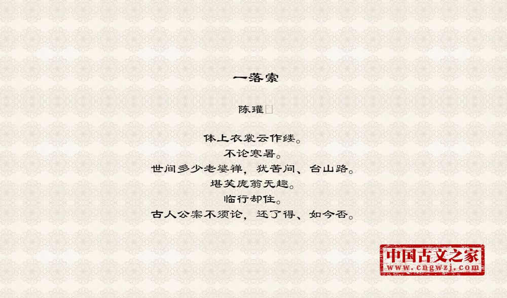 体上衣裳云作缕。不论寒暑。世间多少老婆禅,犹苦问、台山路。堪笑庞翁无趣。临行却住。古人公案不须论,还了得、如今否。