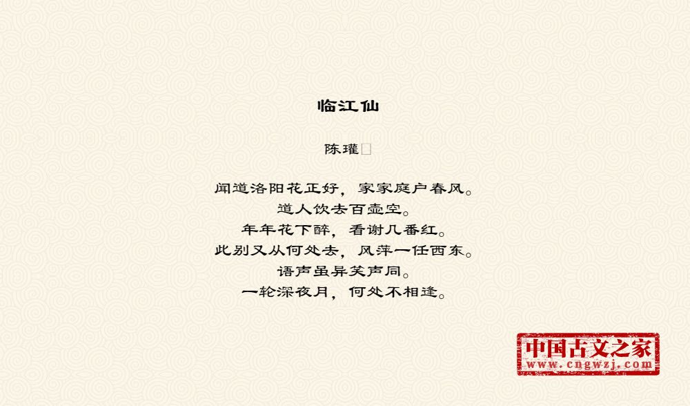 闻道洛阳花正好,家家庭户春风。道人饮去百壶空。年年花下醉,看谢几番红。此别又从何处去,风萍一任西东。语声虽异笑声同。一轮深夜月,何处不相逢。