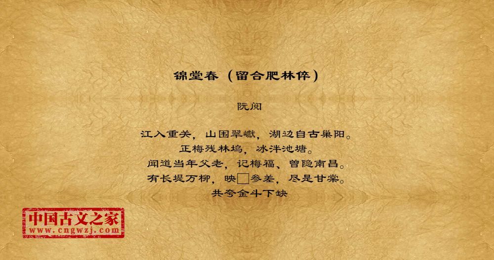 江入重关,山围翠巘,湖边自古巢阳。正梅残林坞,冰泮池塘。闻道当年父老,记梅福、曾隐南昌。有长堤万柳,映□参差,尽是甘棠。共夸金斗下缺