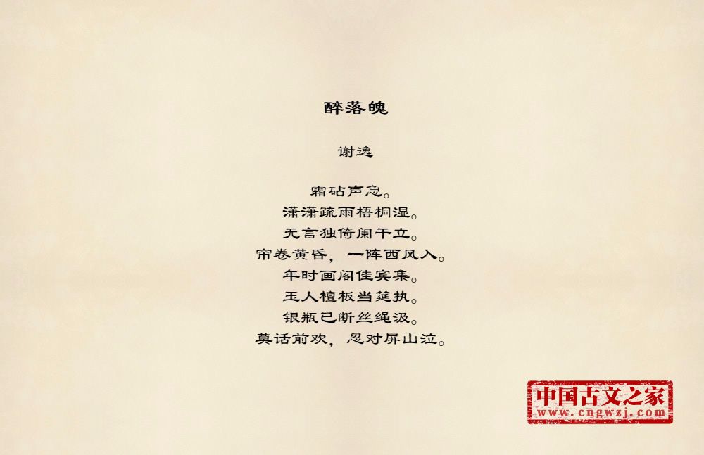 霜砧声急。潇潇疏雨梧桐湿。无言独倚阑干立。帘卷黄昏,一阵西风入。年时画阁佳宾集。玉人檀板当筵执。银瓶已断丝绳汲。莫话前欢,忍对屏山泣。