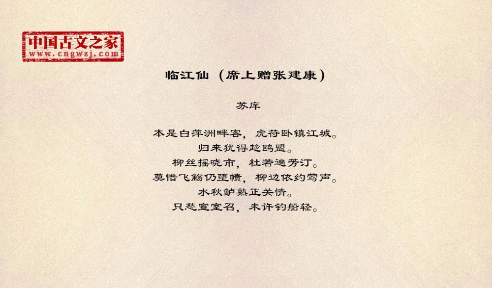 本是白萍洲畔客,虎符卧镇江城。归来犹得趁鸥盟。柳丝摇晓市,杜若遍芳汀。莫惜飞觞仍堕帻,柳边依约莺声。水秋鲈熟正关情。只愁宣室召,未许钓船轻。
