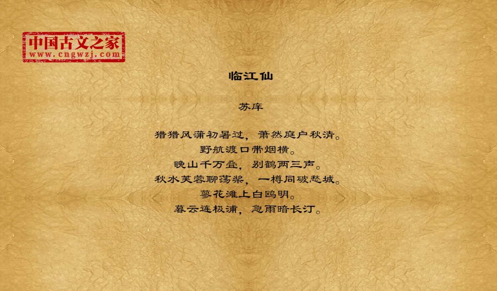 猎猎风蒲初暑过,萧然庭户秋清。野航渡口带烟横。晚山千万叠,别鹤两三声。秋水芙蓉聊荡桨,一樽同破愁城。蓼花滩上白鸥明。暮云连极浦,急雨暗长汀。