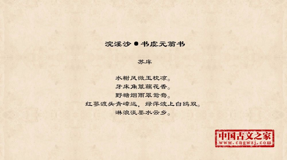 水榭风微玉枕凉。牙床角簟藕花香。野塘烟雨罩鸳鸯。红蓼渡头青嶂远,绿萍波上白鸥双。淋浪淡墨水云乡。