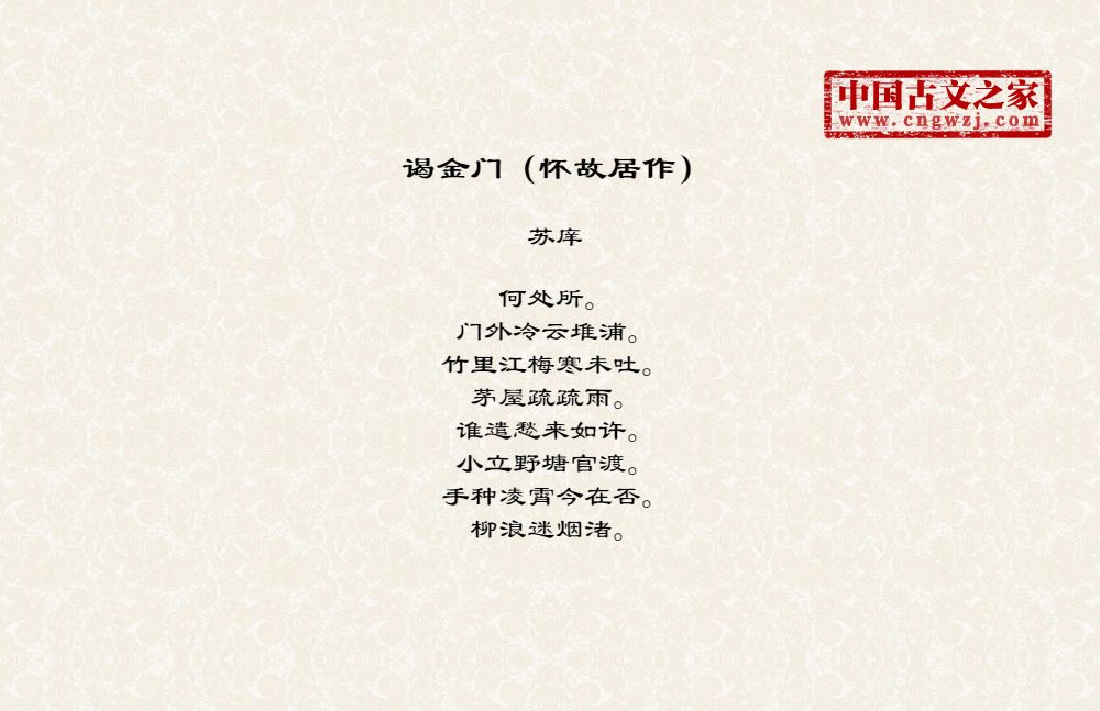 何处所。门外冷云堆浦。竹里江梅寒未吐。茅屋疏疏雨。谁遣愁来如许。小立野塘官渡。手种凌霄今在否。柳浪迷烟渚。
