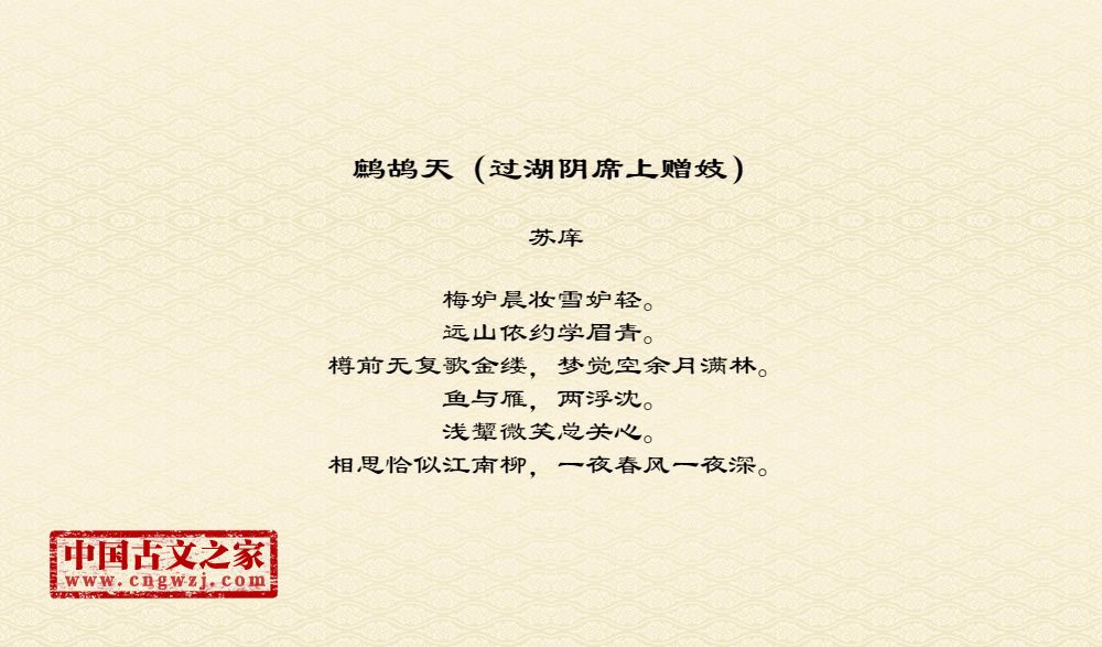 梅妒晨妆雪妒轻。远山依约学眉青。樽前无复歌金缕,梦觉空余月满林。鱼与雁,两浮沈。浅颦微笑总关心。相思恰似江南柳,一夜春风一夜深。