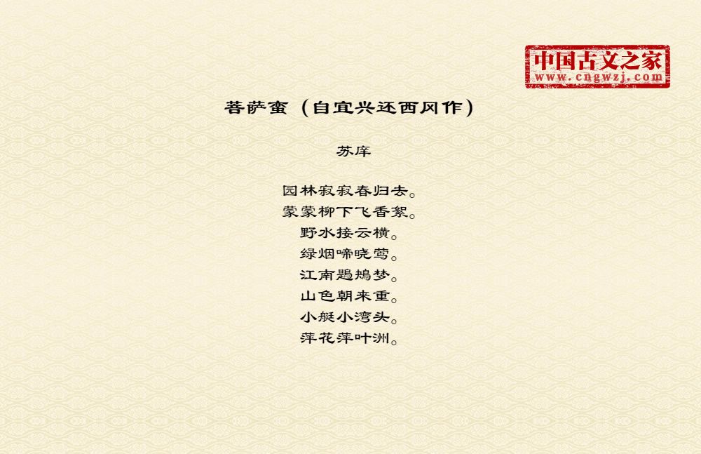 园林寂寂春归去。蒙蒙柳下飞香絮。野水接云横。绿烟啼晓莺。江南鶗鴂梦。山色朝来重。小艇小湾头。萍花萍叶洲。