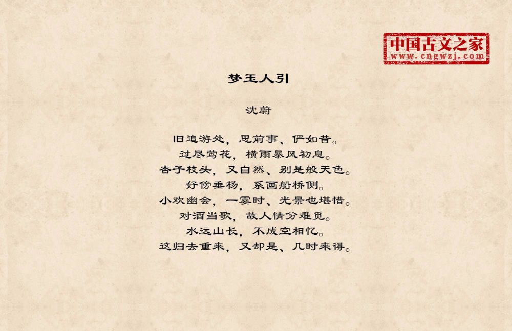 旧追游处,思前事、俨如昔。过尽莺花,横雨暴风初息。杏子枝头,又自然、别是般天色。好傍垂杨,系画船桥侧。小欢幽会,一霎时、光景也堪惜。对酒当歌,故人情分难觅。水远山长,不成空相忆。这归去重来,又却是、几时来得。