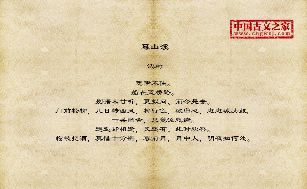 想伊不住。船在蓝桥路。别语未甘听,更拟问、而今是去。门前杨柳,几日转西风,将行色,欲留心,忽忽城头鼓。一番幽会,只觉添愁绪。邂逅却相逢,又还有、此时欢否。临岐把酒,莫惜十分斟,尊前月,月中人,明夜知何处。
